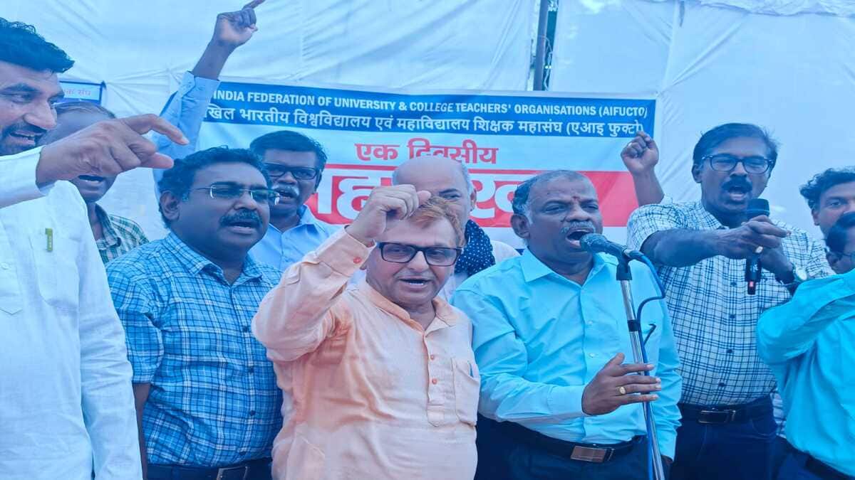 The All India Federation of University and College Teachers’ Organisations (AIFUCTO) calls for the protest. AIFUCTO president M Nagarajan and general secretary Arun Kumar, addressing the gathering, said the government has not engaged in discussions with the federation despite repeated requests.