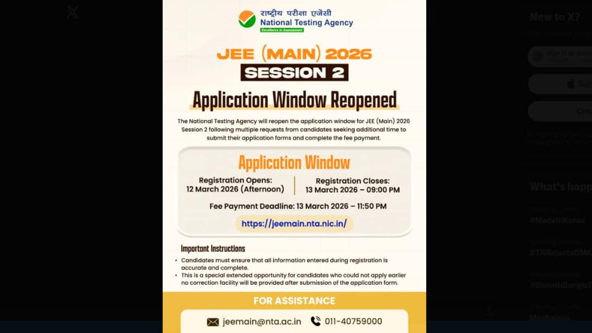 The National Testing Agency (NTA) has reopened the registrations for the JEE Mains 2026 session 2 exams. Candidates can register for the computer-based BTech entrance test through the official website at jeemain.nta.nic.in by March 13 up to 9 pm.