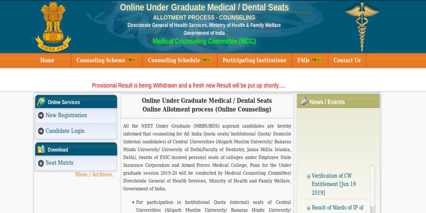 NEW DELHI, July 2: Directorate General of Health Services (DGHS) on behalf of Medical Counselling Committee (MCC) has withdrawn the provisional seat allotment list for round one of NEET 2019 counselling. As per the official notification, the fresh results will be put up shortly. A new schedule for counselling will also be published along with seat allotment list, states the official notice. The allotment letter can also be downloaded only after the publication of final merit list.